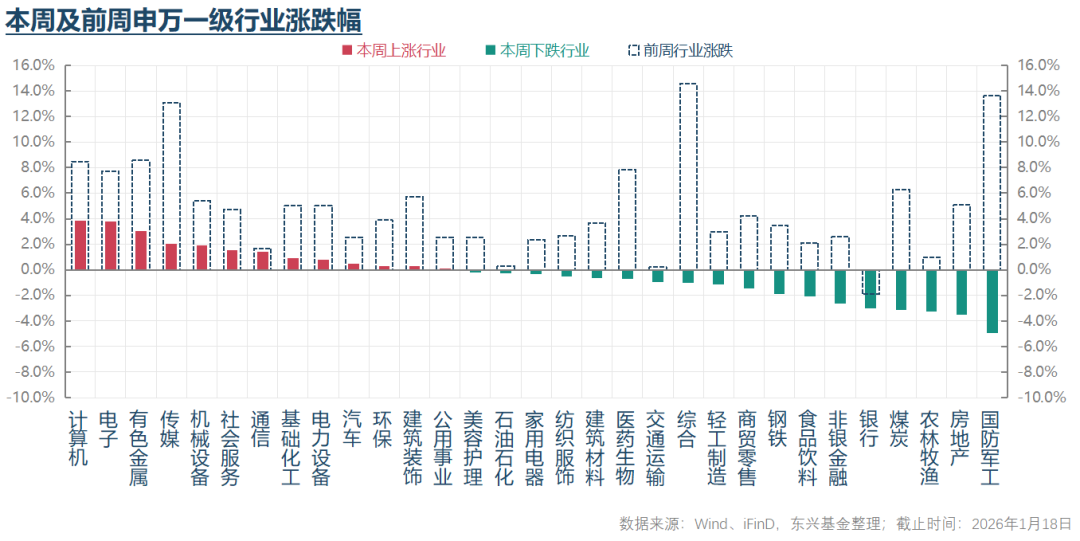 从行业结构看,本周领涨行业包括半导体、软件服务、媒体娱乐、有色金属和硬件设备;领跌行业包括国防军工、电信服务、造纸包装、房地产、煤炭。近期存储芯片价格快速上涨以及有色金属价格延续强势上涨趋势,是构成本周行情结构特征的重要基本面原因。